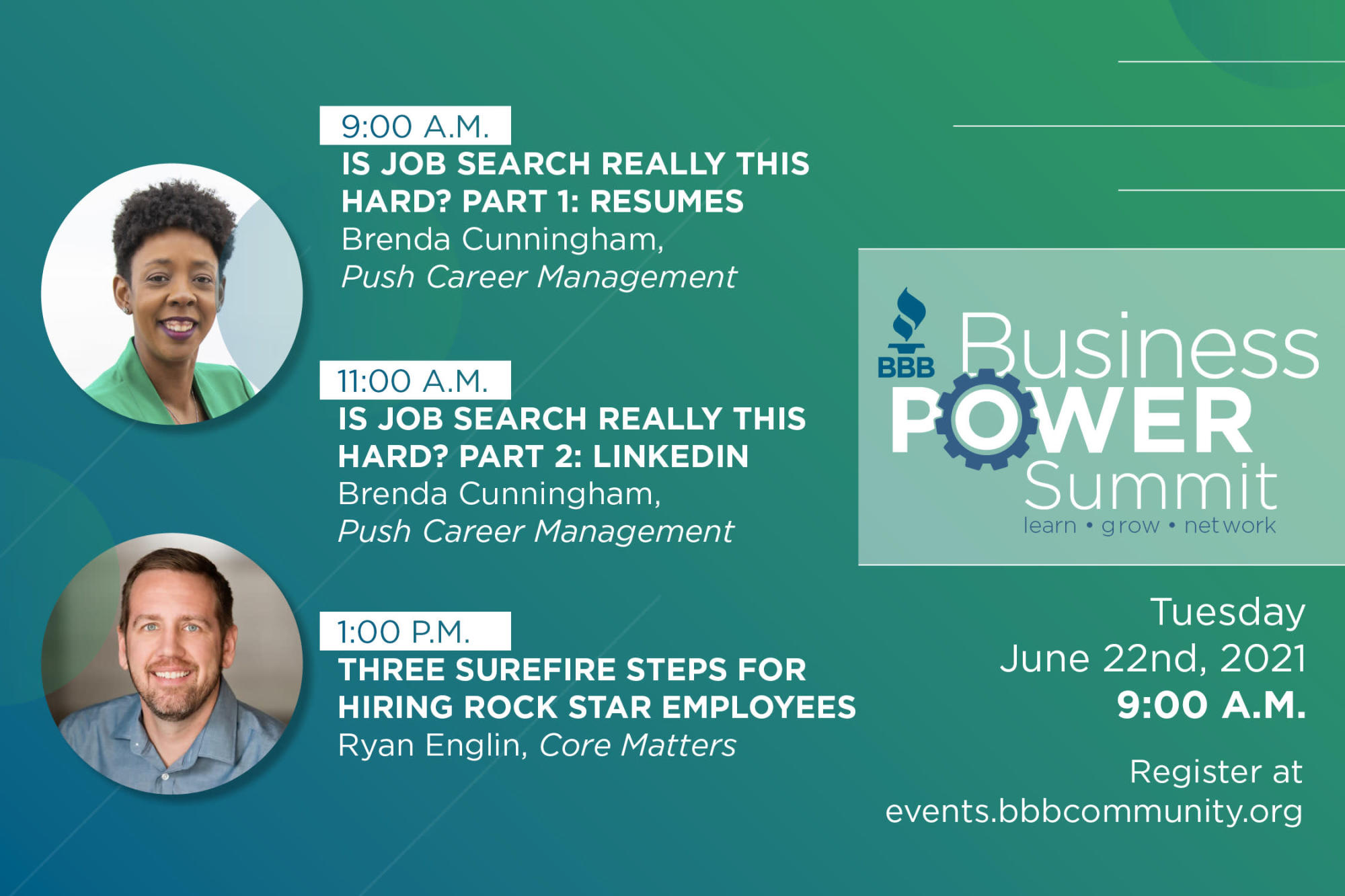 BBB Business Power Summit: Tuesday, June 22, 2021 1. 9:00 am - Brenda Cunningham with Push Career Management will speak about Job Search - Part 1: Resumes 2. 11:00 am - Brenda Cunningham with Push Career Management wl speak about job search - Part 2: LinkedIn 3. 1:00 pm - Ryan Englin with Core Matters will speak about Three Surefire Steps for Hiring Rock Star Employees Registration is at; events.bbbcommunity.org
