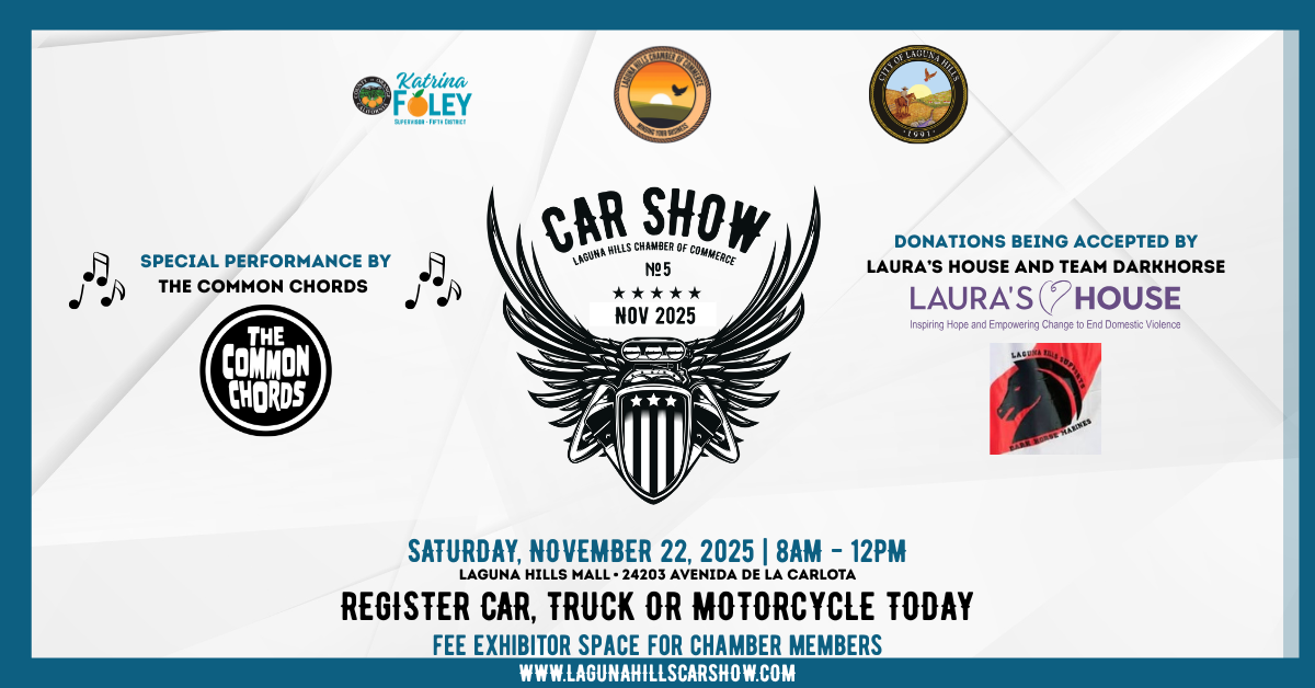 Classic cars, trucks, motorcycles, exhibitors, and volunteers (ages 14 to adult) are all welcome to join the 5th Annual Laguna Hills Car Show on Saturday, November 15, 2025, at the Laguna Hills Mall