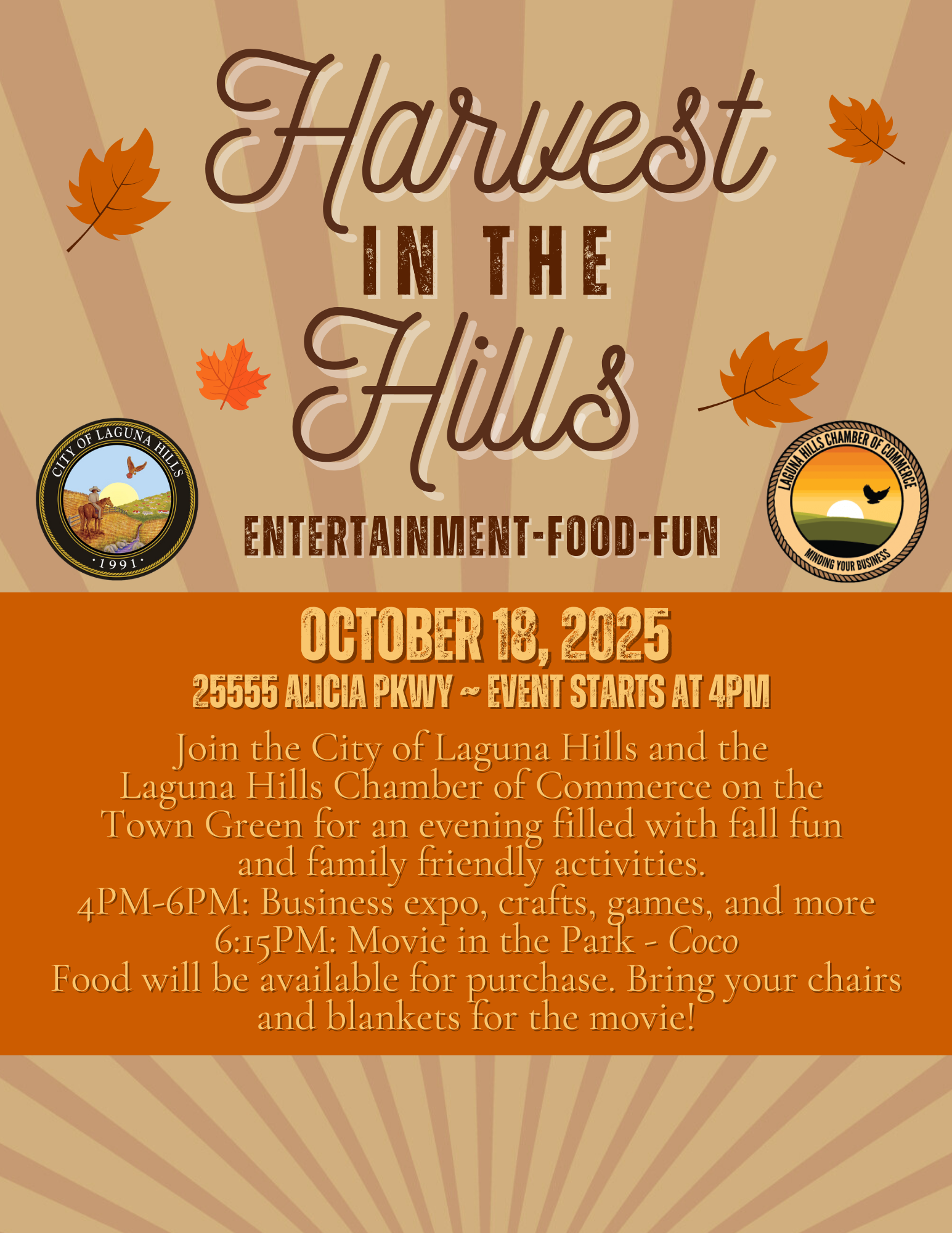October 18, 2025 25555 Alicia Pkwy ~ Event Starts at 4 PM Join the City of Laguna Hills and the Laguna Hills Chamber of Commerce on the Town Green for an evening filled with fall fun and family friendly activities. 4 PM - 6 PM: Business expo, crafts, games, and more 6:15 PM: Movie in the park ~ Coco
