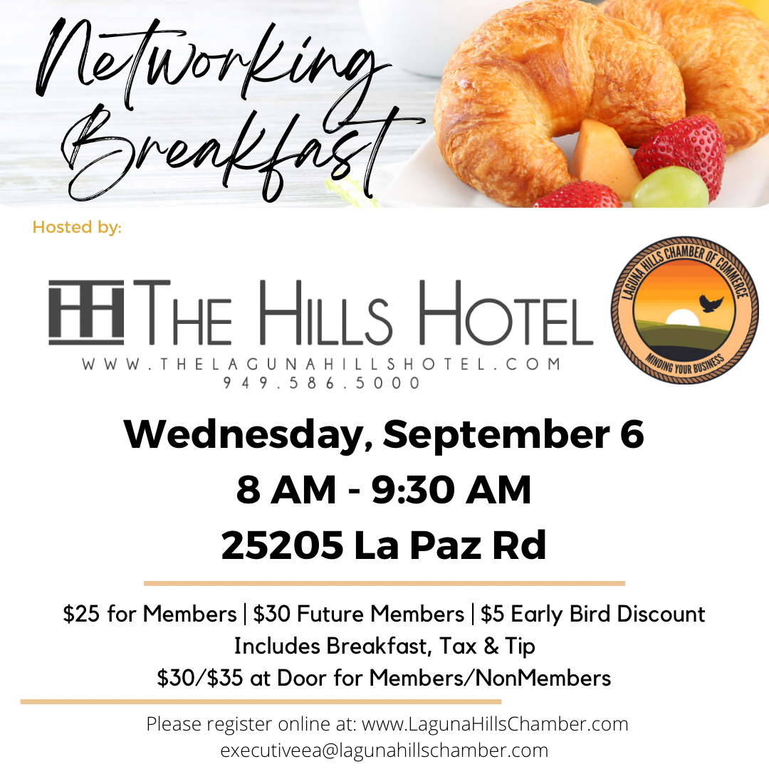 Join us for an early morning Networking Breakfast! All attendees will have the ability to introduce themselves and talk about their business, all while enjoying a delicious hot breakfast. Bring your 30 second commercial, business cards, and a guest!