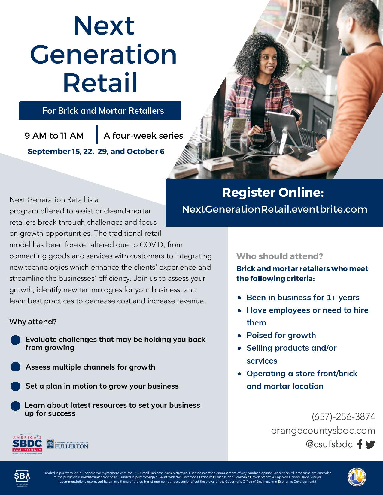 SBDC's Next Generation Retail - A Four-Week Series Back to Search SBDC's Next Generation Retail - A Four-Week Series Thursday, September 29, 2022 (9:00 AM - 11:00 AM) (PDT) Description Additional Info Images × Your Computer Thursday, September 29, 2022 (9:00 AM - 11:00 AM) (PDT) Registered Guests × Share × Print Email Add to Calendar Facebook LinkedIn X Pinterest Powered By GrowthZone