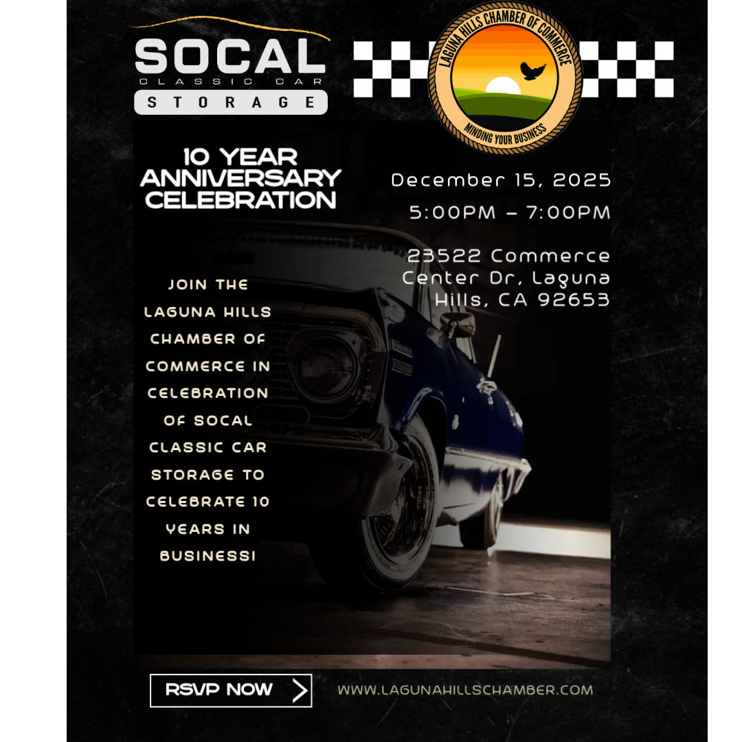 Join the Laguna Hills Chamber of Commerce in celebration of SoCal Classic Car Storage to celebrate 10 years in business!