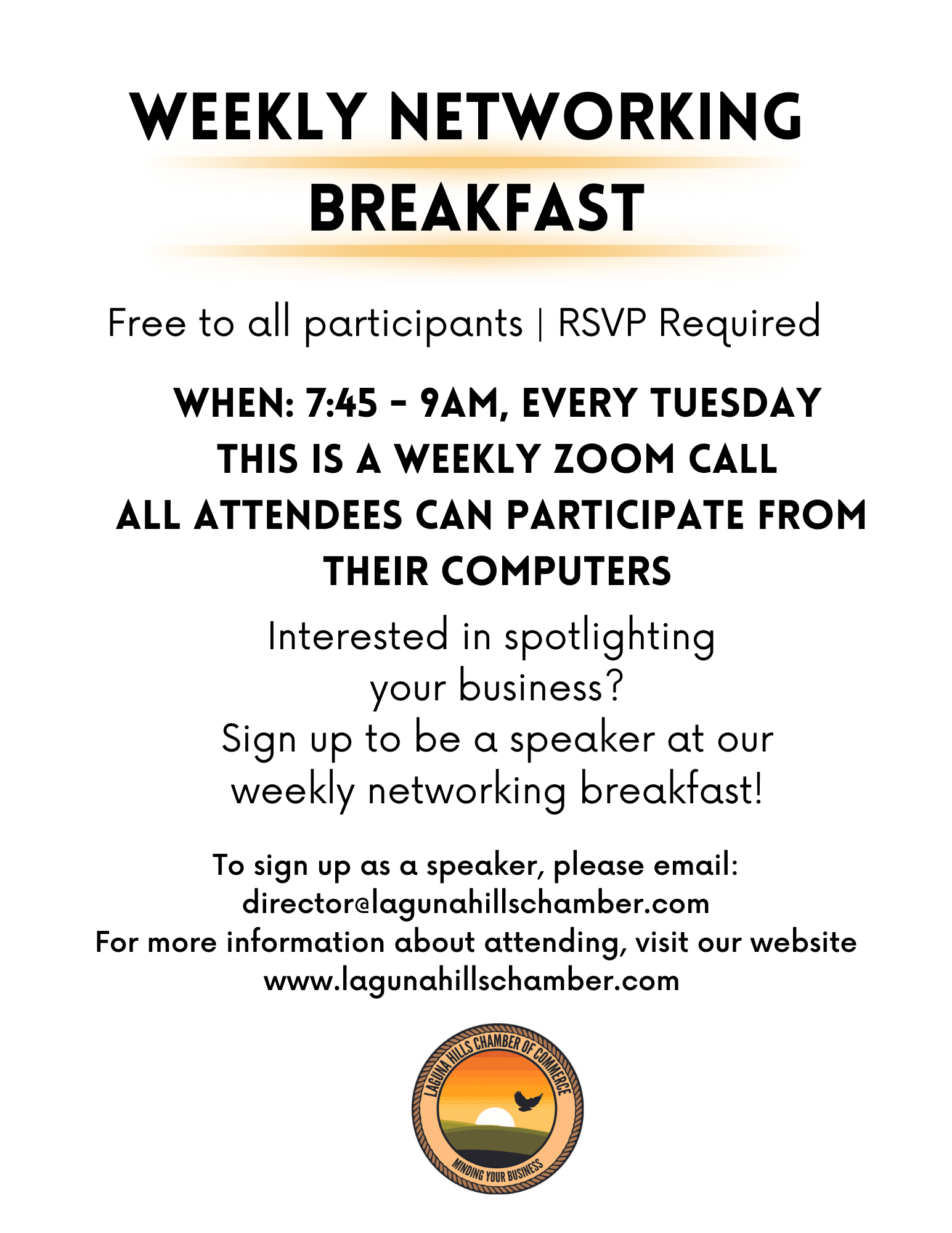 Zoom meeting starts promptly at 8am and ends at 9am. Join in up to 30 minutes early for casual networking.
